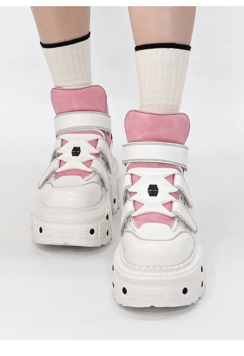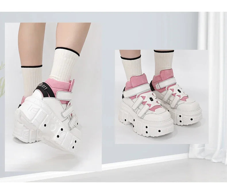Women’s pink-trim laced-up high heel platform shoes blend bold elevation with feminine flair, featuring striking contrast details and a confident, fashion-forward silhouette.